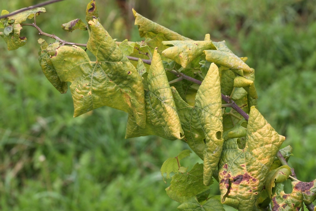 Na listih se pojavi bledikavost ali obarvanje listov, rumenenje listja pri belih oziroma rdečenje listov pri rdečih sortah, listni robovi se vihajo navznoter, listi postanejo togi in krhki, pri mečkanju se zdrobijo, možna je delna nekroza listnih žil. Poganjki postanejo povešeni zaradi pomanjkljivega olesenevanja tkiva, rozge so šibkejše rasti, les je slabo dozorel, pride do poznejšega in neenakomernega odganjanja spomladi. Na grozdju jagode venijo, lahko se posušijo celi grozdi.